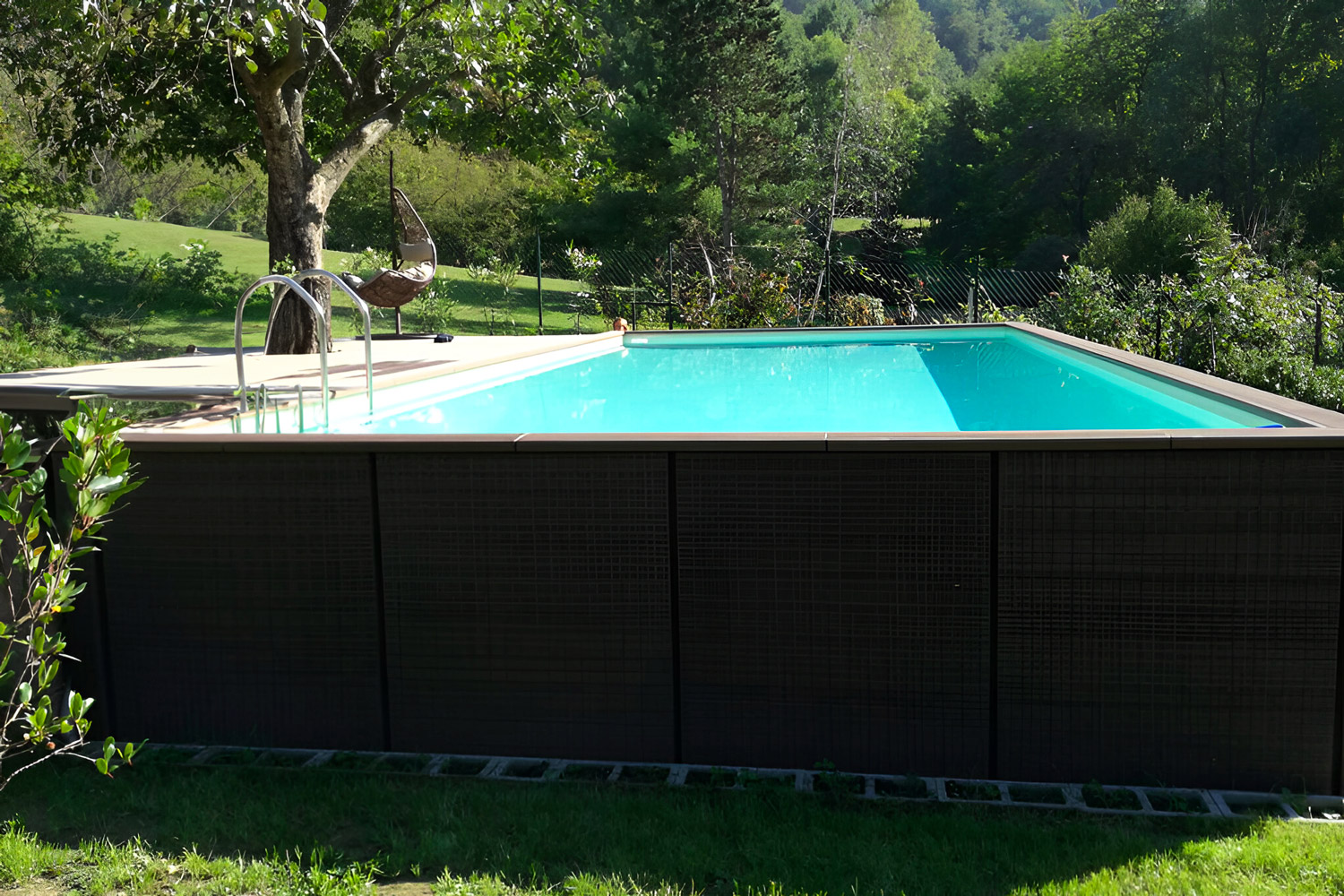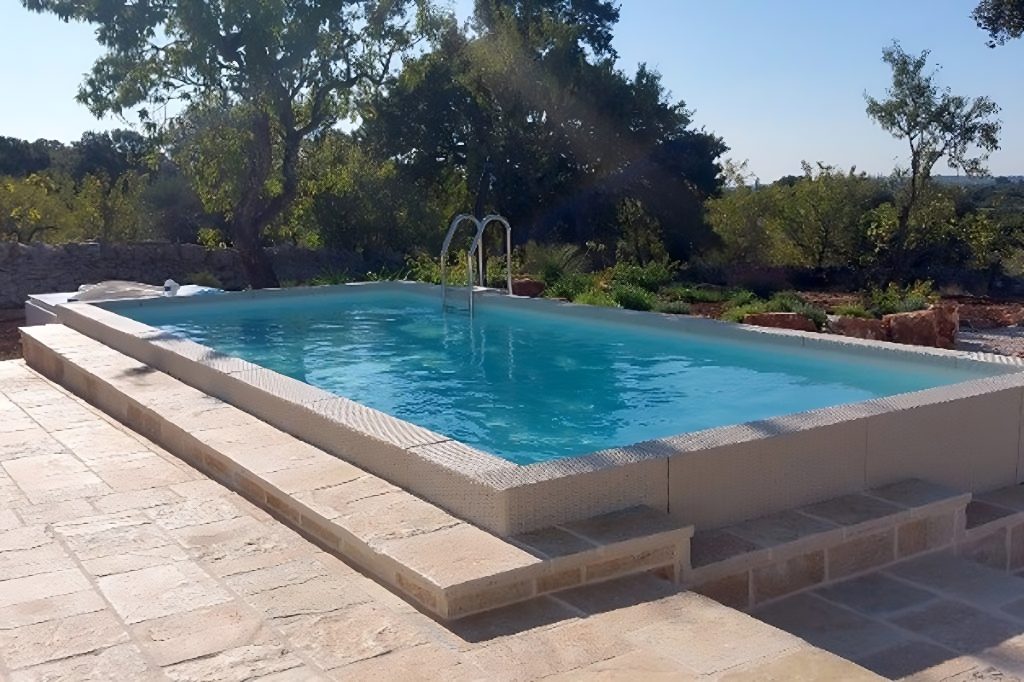 La scala, realizzata in legno, offre un accesso pratico e raffinato alla piscina, valorizzando l’esperienza con una vista mozzafiato e momenti di puro piacere immersi nella natura.
